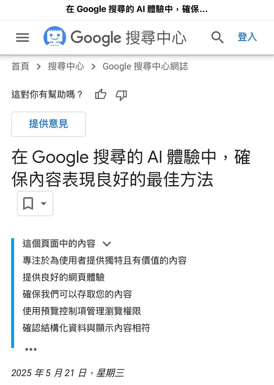 今年 5 月 21 日,Google 發表了一份新指南,清楚指出要讓你的內容在 AI 搜尋裡被看見,有幾個必要條件:
